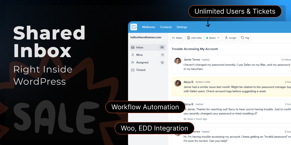 WordPress Helpdesk plugin to manage all your business emails with powerful shared inboxes, right inside WordPress.