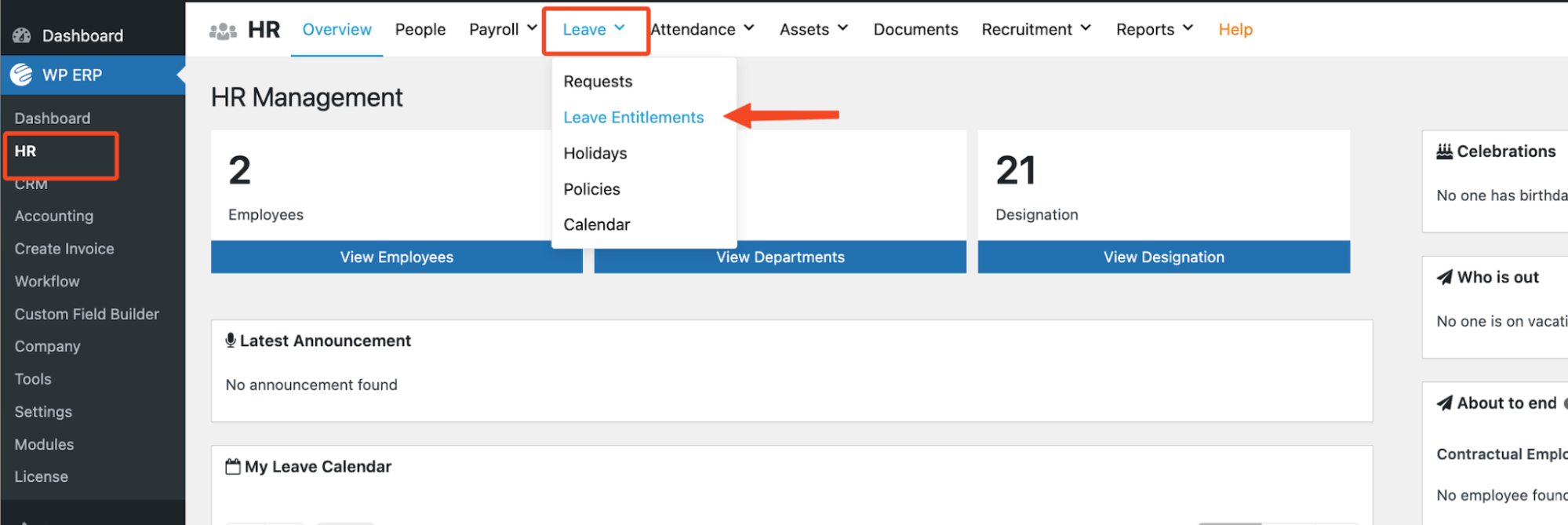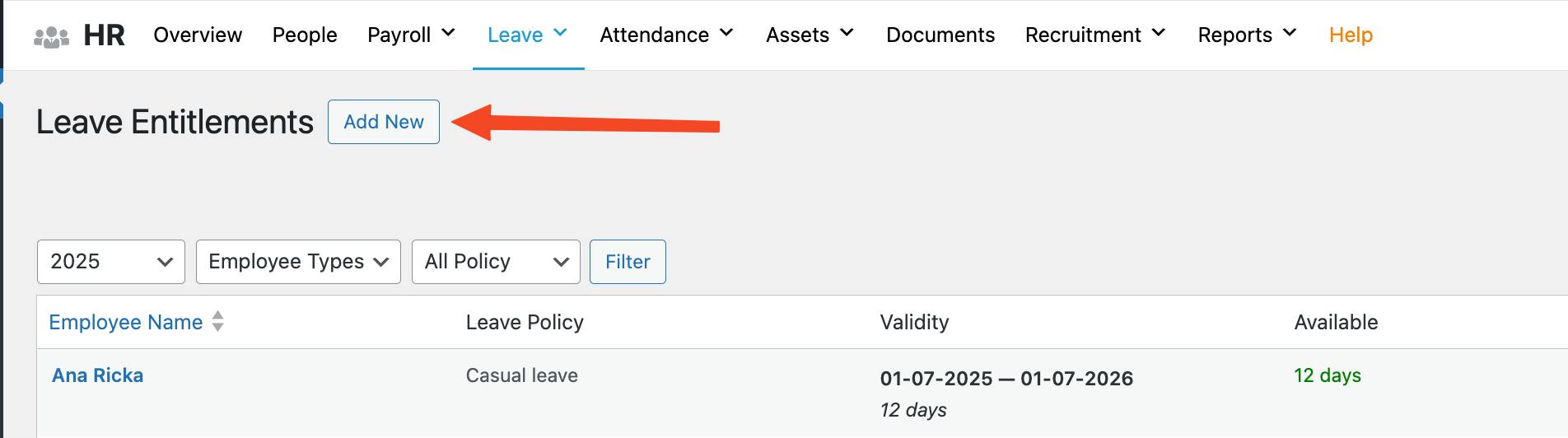 To view the policies and current leave status of all employees, navigate to WP Admin Dashboard → WP ERP → HR → Leave → Leave Entitlements.