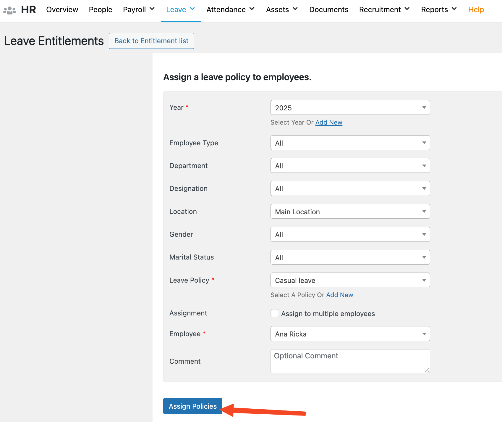 Finally, click Assign Policies. The leave entitlement will now be assigned to the selected department or individual employee.