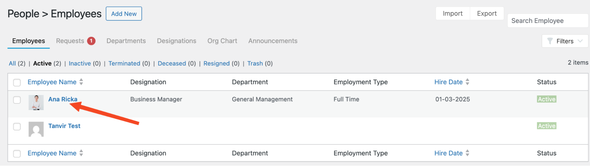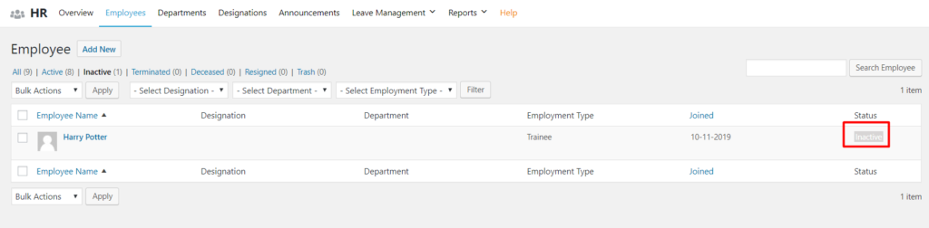 A company operates with active employees, but over time, some may become inactive or resign. With WP ERP HRM, you can easily update an employee’s status.