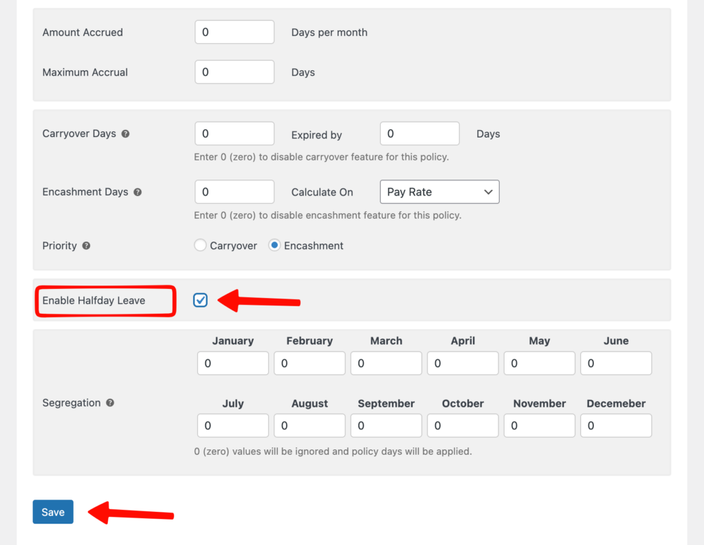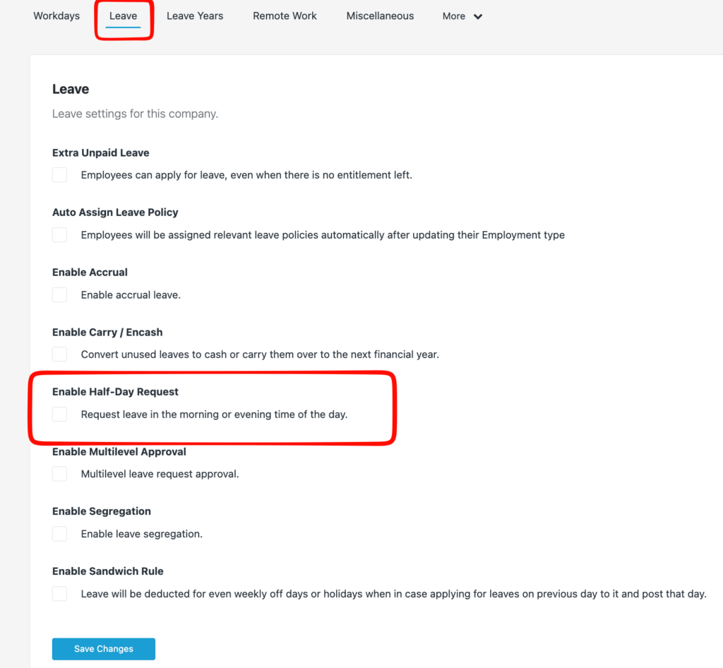 So to enable half-day leave, select your choice of leave policy, then scroll down, enable ‘Half-Day leave‘. That’s it!