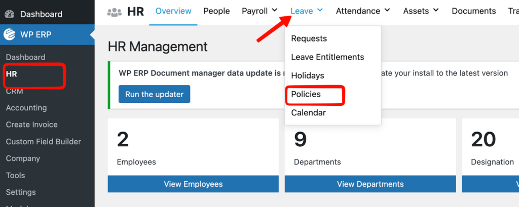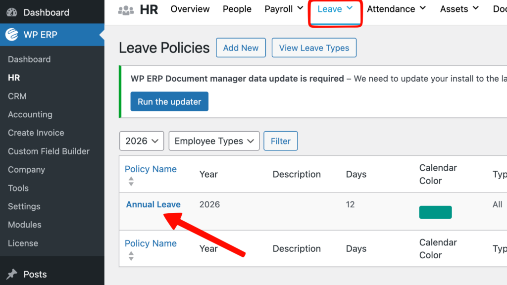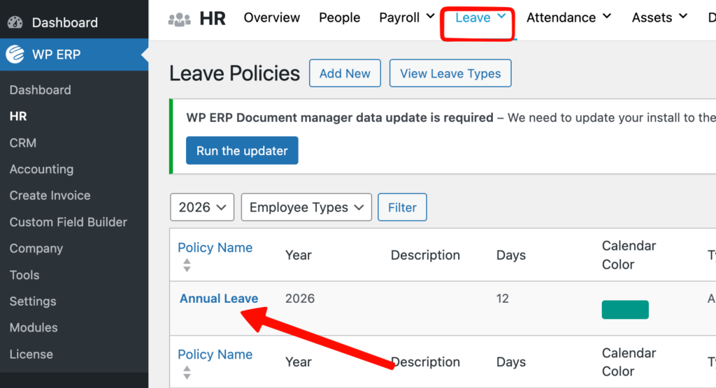 After that navigate to WP ERP > Settings > HR > Leave >Policies