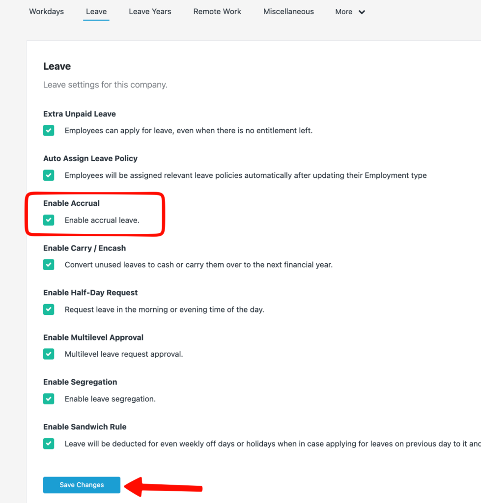 Navigate to WP ERP>Settings>HR>Leave> Enable Accrual Leave