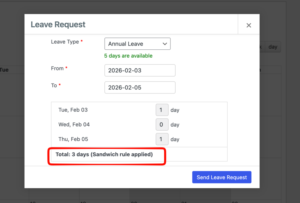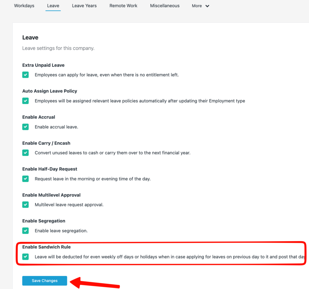 To enable the sandwich rule, navigate to WP ERP> Settings>HR>Leave> and Enable Sandwich rule.