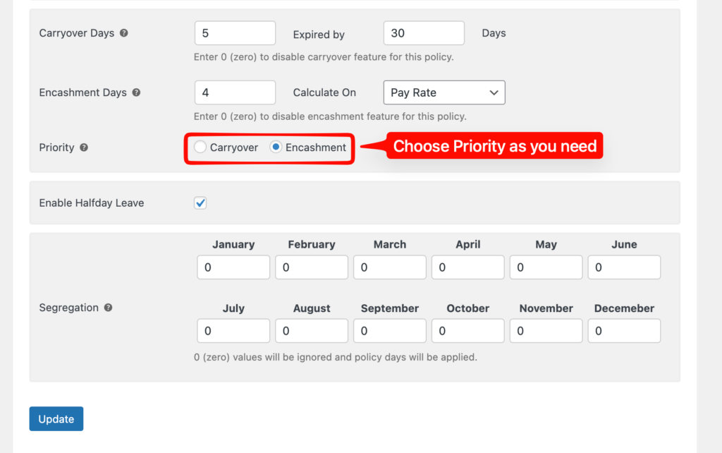 Also, you can set the priority for that purpose. As we selected annual leaves, so carry forward leaves can be applicable in this case. Therefore, you can disable leave encashment giving zero (0) value.