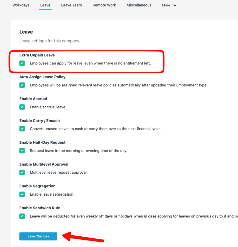 To enable ‘Unpaid Leave‘ navigate to the WP ERP>Settings>HR>Leave> Enable Unpaid Leave.
