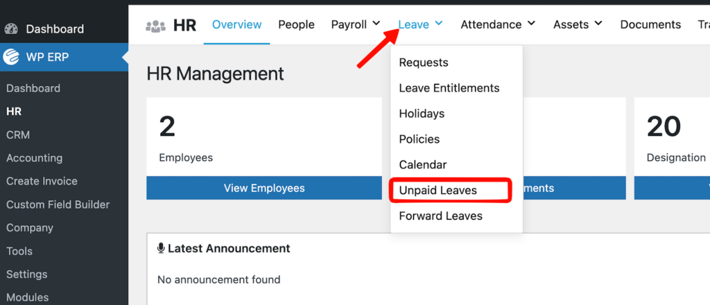 Then go to the WP ERP>Settings>HR>Leave Management>Unpaid Leave