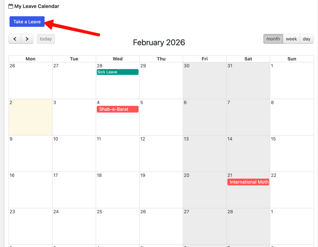First of all, login as an employee and then navigate to the WP ERP>HR Dashboard>Take a leave.