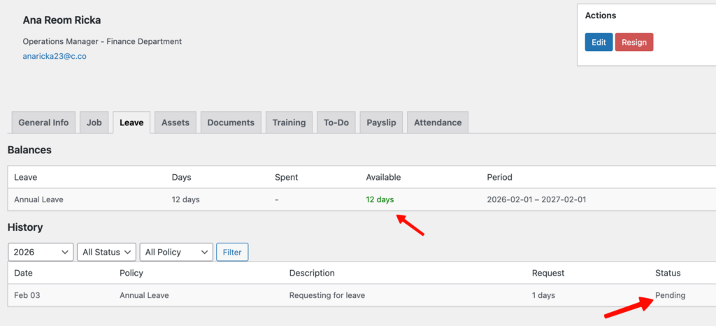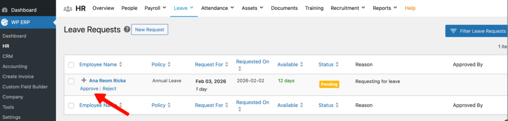 So he/she can see the leave request is still in the pending column. Therefore, the admin can finalize the leave by clicking on the ‘Approve‘ button.