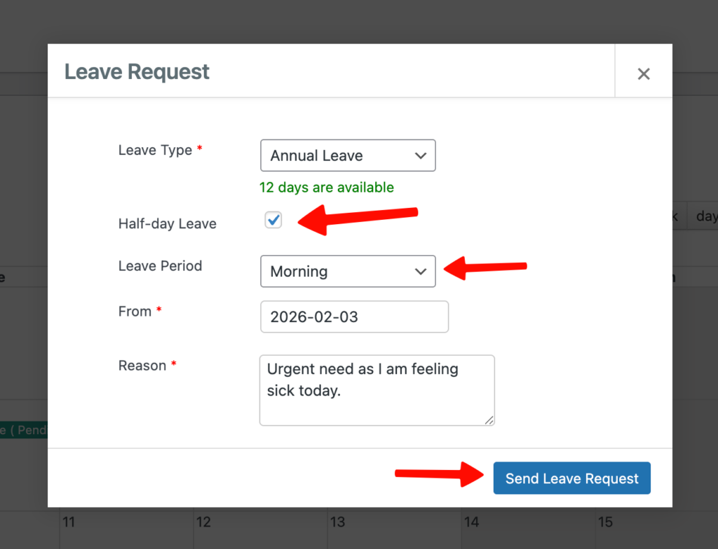 So tick the half-day leave and select the shift (Morning or Afternoon). Then select the date and click on ‘Send Leave Request’. After that, it will be sent to your prospective department head for approval.