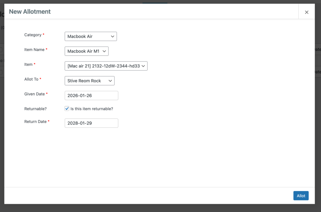 - Navigate to WP Admin Dashboard → WP ERP → HR → Assets Management → Allotments → New Entry.