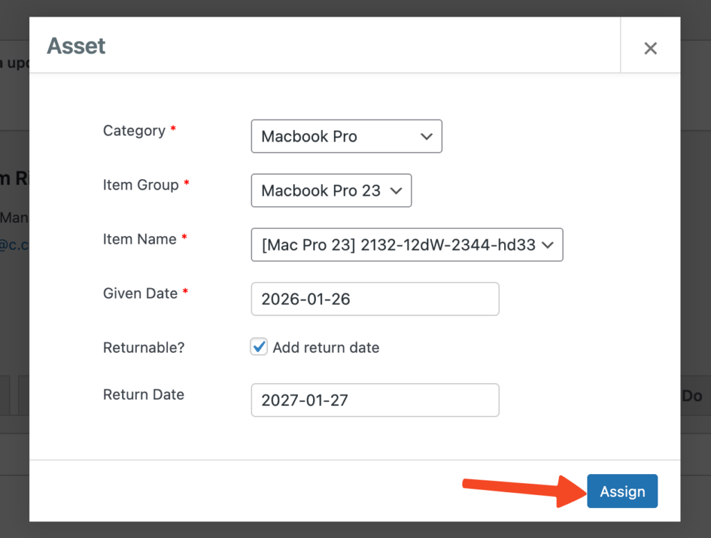 3. Admin can also add a return date to indicate when the employee has to return the asset to the company.