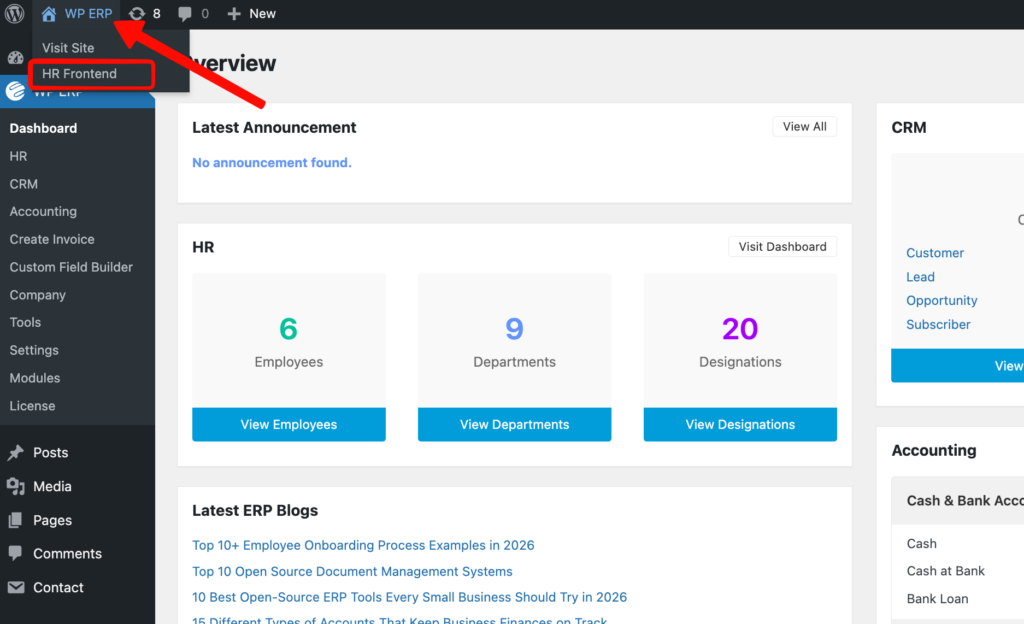 Now you can check this updated slug on your browser from the frontend by clicking on WordPress ERP→HR Frontend.