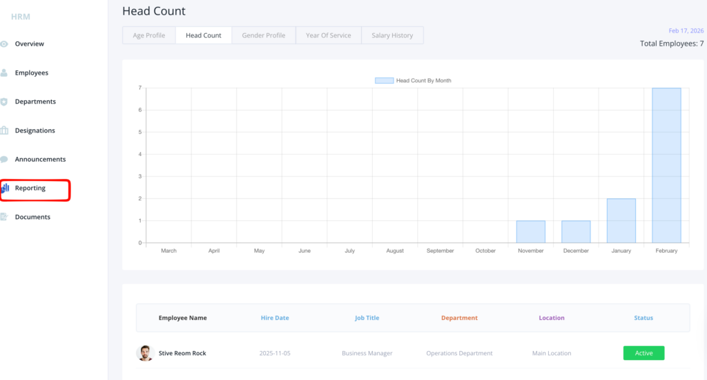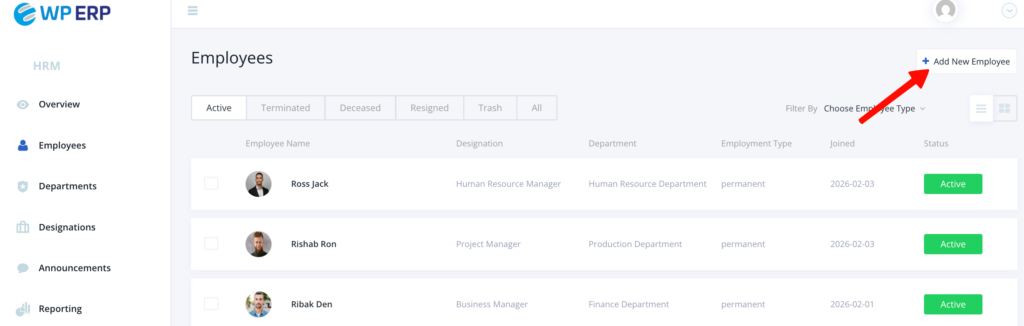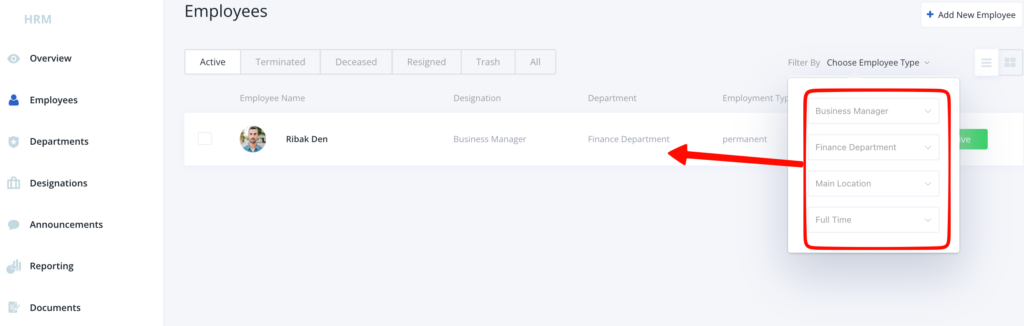 These tabs will show you the Employee Name, Designation, Department, Employment Type, Joining Date, and Status in ta table format.