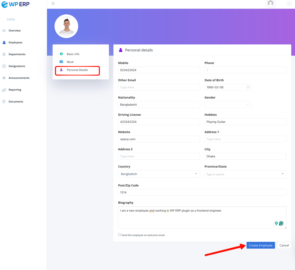 You can also add Personal Details, Work Experience, Education, and Dependants of the employee.