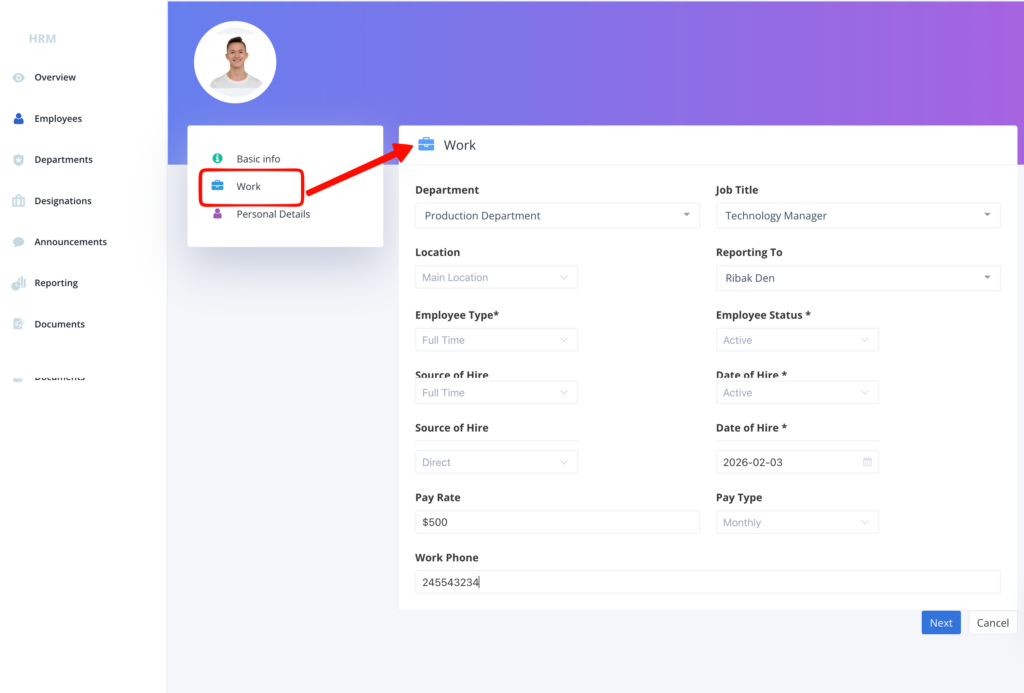 Under Work, add the department, job title, reporting head, status, type and a lot more details.
