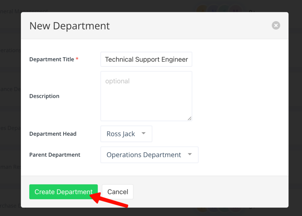 From here you can input Department Title, Description, and choose the Department Head and Parent Department from the given drop-downs.