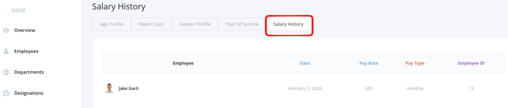 e) Salary History: Shows Salary History of the employees of your company.