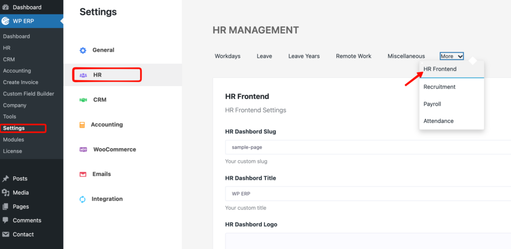 1) Navigate to WordPress ERP dashboard→ERP→Settings→HR→More.