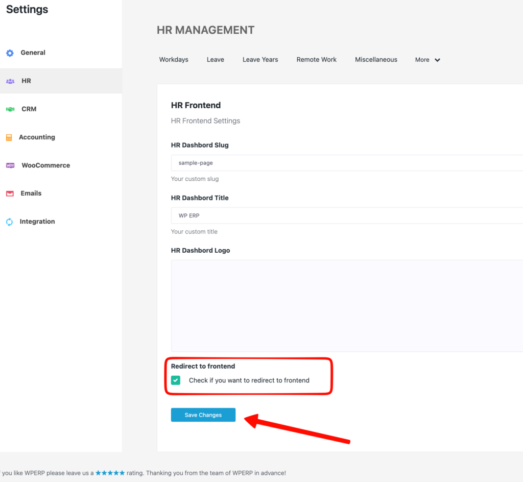 Once activated, you will find a new tab under WordPress ERP when you click on it, with the name HR Frontend: