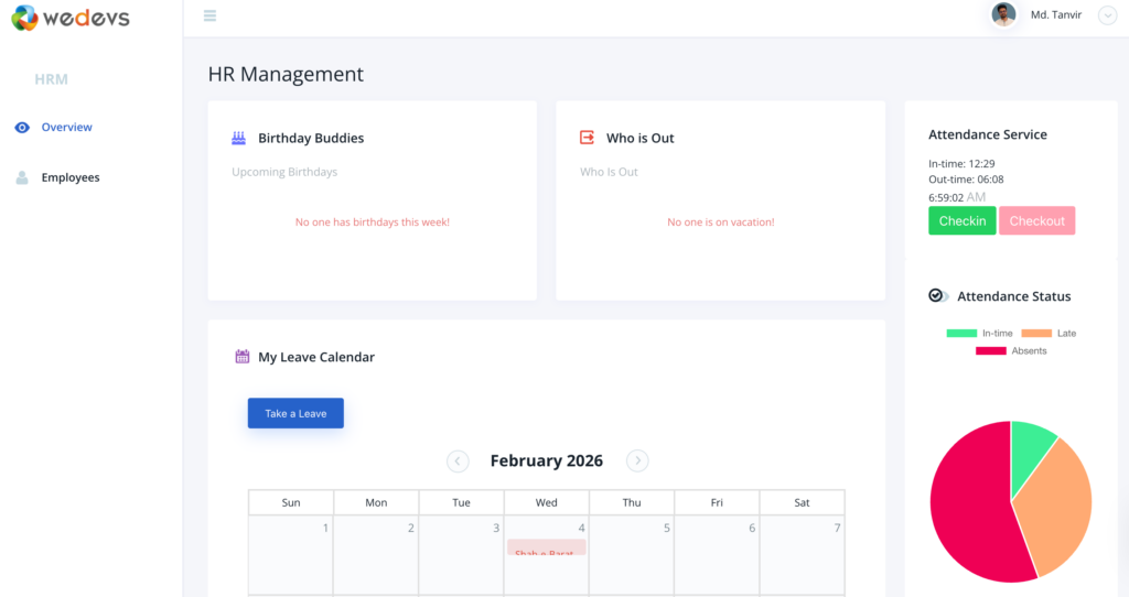 You can view all your employees and their profile from HR Frontend. The dashboard page gives an overview of your HR module including a leave calendar. You can click on the View Employees button to view the list of your employees.