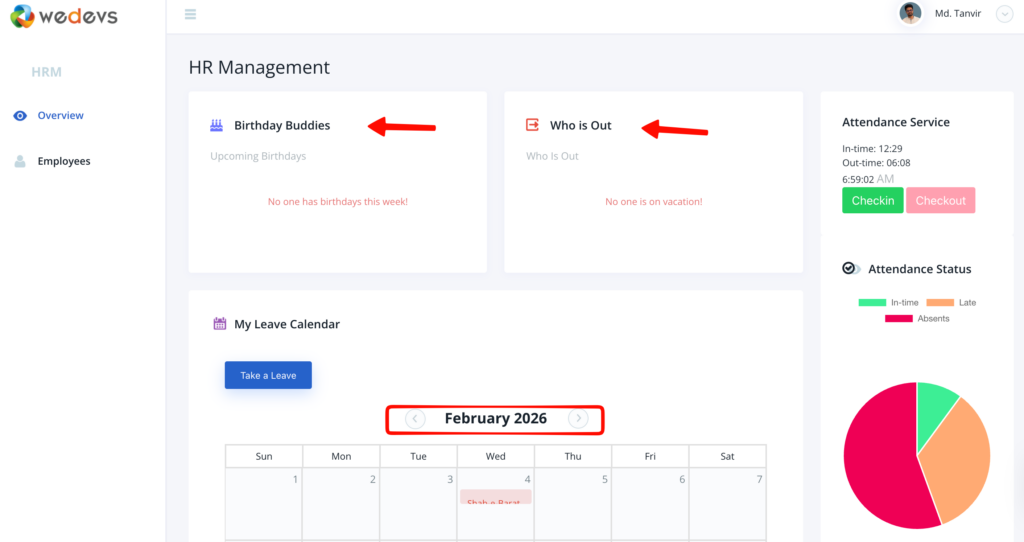 Employees can also view the upcoming birthdays of other employees as well as who is on leave on what day.