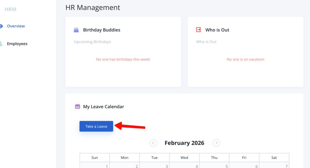 Employees can navigate to their HR Dashboard and click on the Take a Leave button under My Leave Calendar.