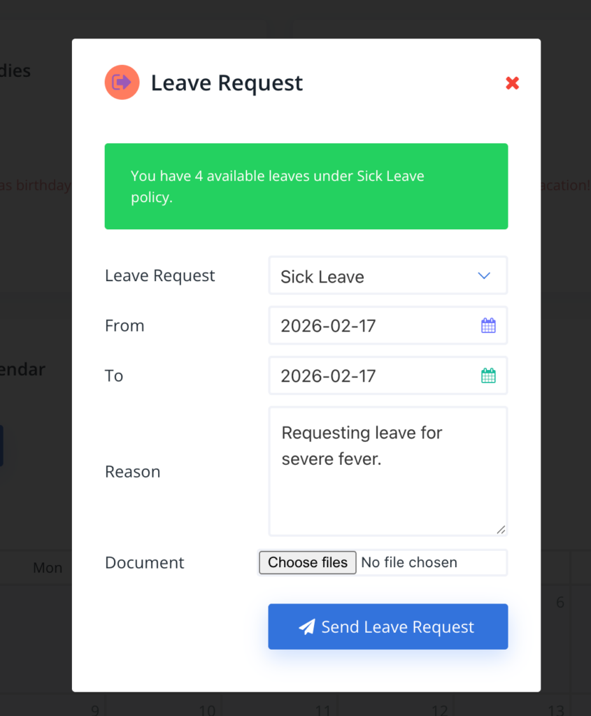 The above pop-up is the leave request form. Employees can select the leave type from the drop-down, leave dates and leave reason.